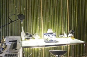 El bambú ofrece frescura y una sensación vida, de espacio abierto y frescura, además de que funciona como un aislante sonoro para el estudio. La luz alimenta ese perfil al emanar suavamente de la mesa de trabajo: es funcional sin romper la sensación de irrealidad lograda con el bambú.