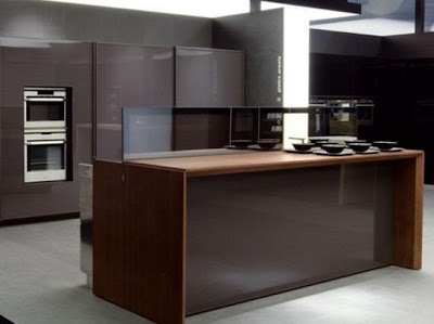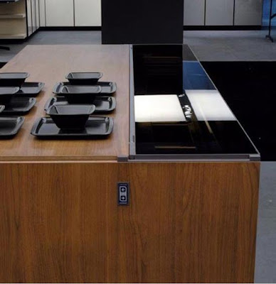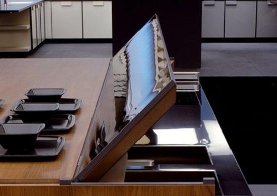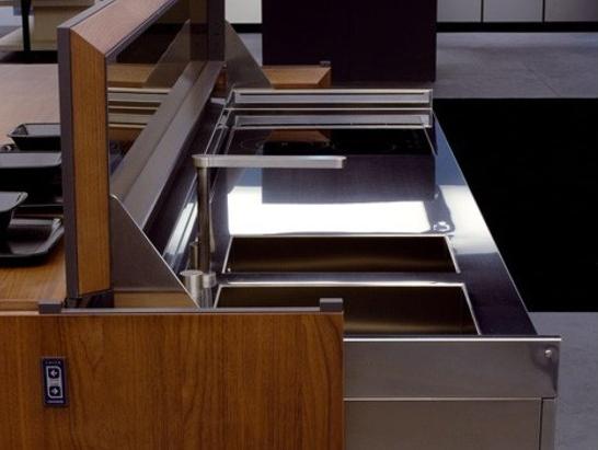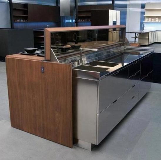 Se trata de una isla de cocina automatizada. Esto es posible ya que posee un motor gracias al cual es posible abrir y cerrar de manera inmediata una tapa que cubre la parte destinada a la zona de trabajo. Convirtiéndola rápida y fácilmente en un mobiliario perfectamente decorativo.