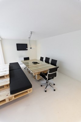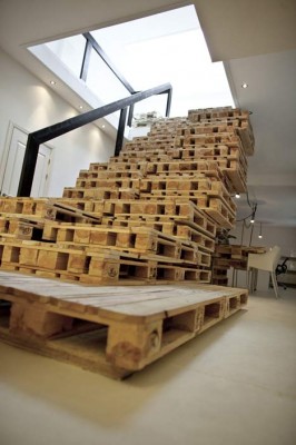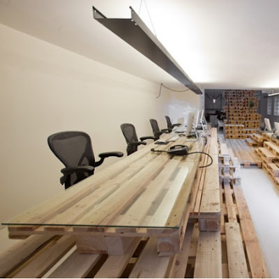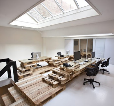 Se trata de pallets convertidos en mesas, sillas, escaleras, escritorios… Una buena dosis de imaginación, cojines, cristales para las mesas y listo: una oficina realmente original y muy llamativa.