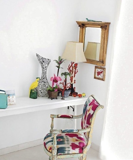 La verdad es que estas mesas quedan genial y no ocupan mucho espacio, aunque lo cierto es que una de las que más me gustan es la que tiene puertas, que al abrirse deja ver una pared empapelada con estampado de flores.